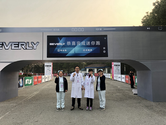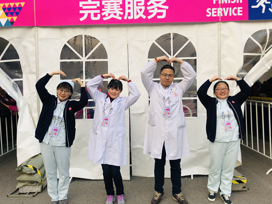 我院护士王璐在半程马拉松终点提供医疗保障服务,护士关贝贝在全马29公里处提供医疗保障服务。康复医师黄长耀、计樱莹,护士杨红、季子琪在迷你马拉松终点提供医疗保障服务。
