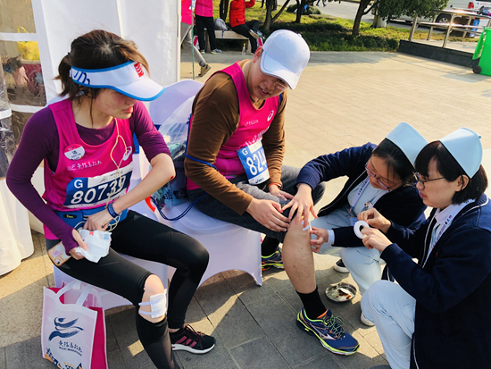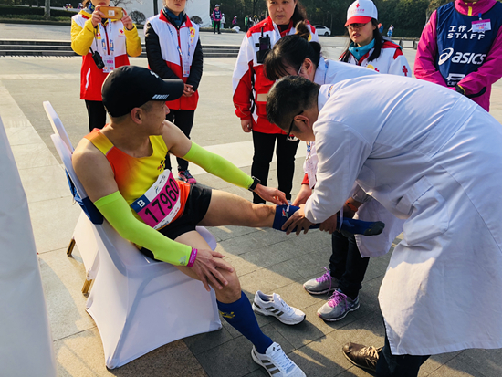 全马选手小聂,由于胫前肌痉挛,无法完成比赛,进入迷马救护站,我院医护志愿者悉心处理,予以帮助,小聂感激不已。