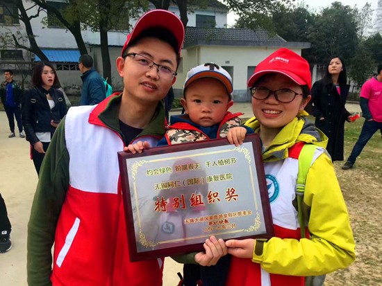 院内植树现场,到处人头攒动,薛美华副院长和党员们一起挖坑、扶树、填土,大家三五成群,干得热火朝天。每栽好一棵树,党员们都用手扶正、用脚踩实,整个过程一气呵成,显得非常熟练。“我参加植树节活动已经5年了,在医院开展植树活动还是第一次,能为医院妆点更多绿色,我即兴奋又骄傲……”小李一边挥汗如雨,一边兴奋地说。马山和平村植树现场,统一身着红白色马甲的康复治疗师们正栽种着一株株陕西软籽石榴,一个个忙碌的身影掀起了植树热潮。康复治疗师贾澄杰更是携妻带子全家齐上阵。“在这个充满希望的春天里,用我们的双手点燃绿色之光,为祖国大地披上绿毯,我为我们种的小树林起了一个好听的名字叫‘绿光森林’”!刚步入工作岗位一年的小方骄傲地说。