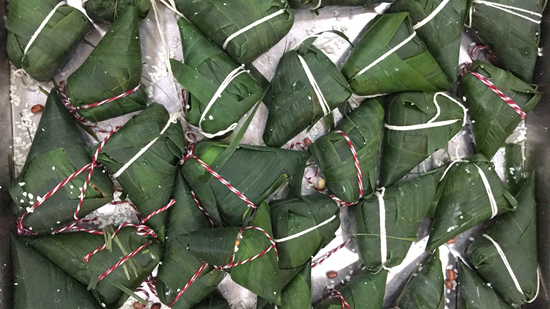参赛选手们劲头十足,双手轻卷芦苇叶,舀上米,左缠右绕,再把绳子系紧,糯米、粽叶在心灵手巧的选手们手上翻转飞舞。“这个粽叶你要卷成漏斗状,再塞材料进去。糯米压紧实,绳子要绑紧,否则会‘露馅’。”旁观的吃瓜群众们也热情非凡,讨论着参赛选手们的优劣,还不时向他们支招、传授经验。