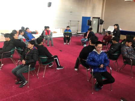 只见音乐治疗师们组织学生们围成一个圆圈,利用“拍手”“拍腿”“跺脚”等简单的动作配合音乐节奏轮流进行自我介绍。刚开始时,同学们都很拘谨也很害羞,不敢大声地说出自己的名字和班级,有的同学说话的声音小到旁边的人都听不到,但在音乐治疗师的不断鼓励和团队的支持下,慢慢地同学们都从紧张、胆怯中放松下来。