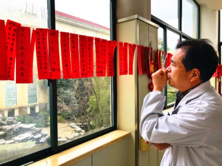 2月19日中午,医院二楼食堂门口的过道已经被350条大红的谜语装点得格外喜庆,这些谜语谜面生动有趣,既有娱乐性又具知识性,吸引了很多患者和医务人员驻足猜谜。