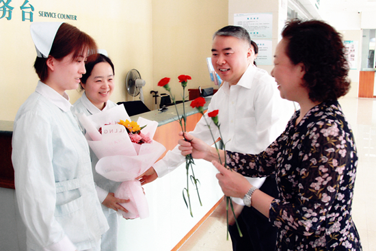 5月12日,第108个国际护士节之际,医院党委副书记王庆良,院长、党委副书记薛美华,副院长周振和携相关职能部门负责人,亲切看望慰问奋战在临床一线的广大护理工作者,向辛勤工作的护士们送上鲜花,致以节日的祝福与问候,感谢她们用自己的行动实践着投身护理事业的诺言。