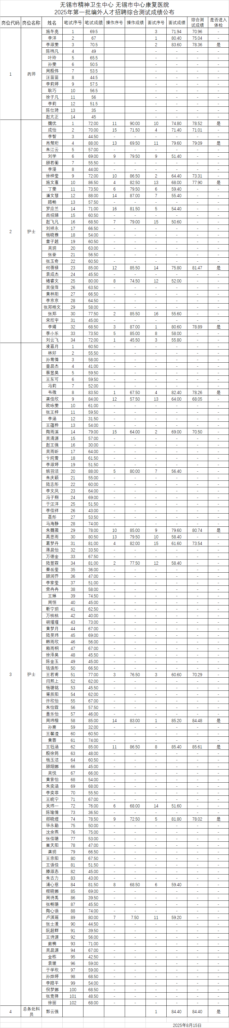 2025年第一批编外人才招聘综合测评成绩公布